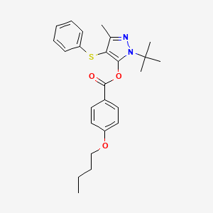 The mechanism of action of (2-Tert-butyl-5-methyl-4-phenylsulfanylpyrazol-3-yl) 4-butoxybenzoate involves its interaction with specific molecular targets. The phenylsulfanyl group may interact with enzymes or receptors, modulating their activity. The ester moiety can undergo hydrolysis, releasing the active pyrazole derivative, which can further interact with biological targets.