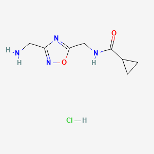 N-{[3-(Aminomethyl)-1,2,4-oxadiazol-5-YL]methyl}cyclopropanecarboxamide hydrochloride is a compound of significant interest in medicinal chemistry due to its potential biological activities. This article explores its biological activity, focusing on its mechanisms of action, therapeutic applications, and relevant research findings.