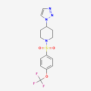 4-(1H-1,2,3-Triazol-1-yl)-1-((4-(trifluoromethoxy)phenyl)sulfonyl)piperidine is a synthetic piperidine derivative featuring a 1,2,3-triazole ring at the 4-position and a sulfonyl group at the 1-position of the piperidine core. The sulfonyl group is further substituted with a 4-(trifluoromethoxy)phenyl moiety. This compound exemplifies the strategic integration of heterocyclic and electron-withdrawing groups to modulate physicochemical and pharmacological properties. The triazole ring is likely synthesized via copper(I)-catalyzed azide-alkyne cycloaddition (CuAAC), a cornerstone of click chemistry , while the sulfonylation step may involve reactions with sulfonyl chlorides or related electrophiles . The trifluoromethoxy group enhances metabolic stability and lipophilicity, making the compound a candidate for drug discovery, particularly in therapeutic areas such as central nervous system disorders or oncology .