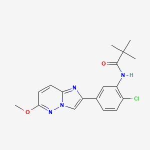 N-(2-chloro-5-(6-methoxyimidazo[1,2-b]pyridazin-2-yl)phenyl)pivalamide is a heterocyclic compound featuring a pivalamide group (tert-butyl carbamate), a chlorine substituent, and a 6-methoxyimidazo[1,2-b]pyridazine moiety. The chlorine atom at the 2-position of the phenyl ring likely enhances electrophilicity and binding specificity, while the methoxy group on the pyridazine ring may influence solubility and metabolic stability.