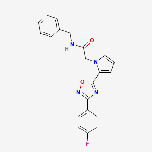 The synthesis of N-benzyl-2-{2-[3-(4-fluorophenyl)-1,2,4-oxadiazol-5-yl]-1H-pyrrol-1-yl}acetamide typically involves multiple steps, starting from readily available precursors. One common synthetic route involves the formation of the oxadiazole ring through a cyclization reaction of a hydrazide with a carboxylic acid derivative. The pyrrole ring can be introduced via a condensation reaction with an appropriate aldehyde or ketone. The final step involves the benzylation of the nitrogen atom on the pyrrole ring using benzyl bromide under basic conditions .