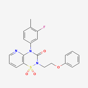The compound 4-(3-fluoro-4-methylphenyl)-2-(2-phenoxyethyl)-2H-pyrido[2,3-e][1,2,4]thiadiazin-3(4H)-one 1,1-dioxide is a complex heterocyclic structure that has garnered interest for its potential biological activities. This article delves into the biological activity of this compound, focusing on its pharmacological effects, mechanisms of action, and relevant case studies.