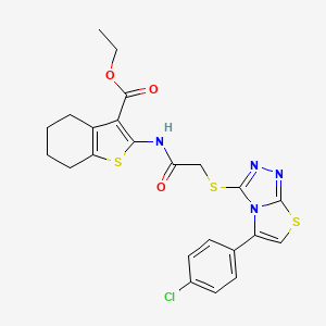 ETHYL 2-(2-{[5-(4-CHLOROPHENYL)-[1,2,4]TRIAZOLO[3,4-B][1,3]THIAZOL-3-YL]SULFANYL}ACETAMIDO)-4,5,6,7-TETRAHYDRO-1-BENZOTHIOPHENE-3-CARBOXYLATE is a complex organic compound that belongs to the class of thiazole and triazole derivatives. These compounds are known for their diverse biological activities, including antimicrobial, antifungal, antiviral, and anticancer properties . The unique structure of this compound, which includes a thiazole ring fused with a triazole ring, makes it a subject of interest in medicinal chemistry and pharmaceutical research.