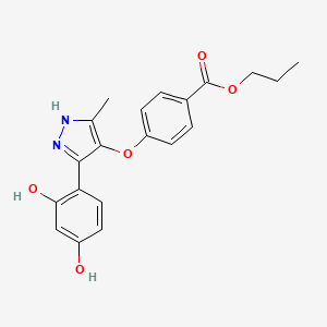 Propyl 4-{[5-(2,4-dihydroxyphenyl)-3-methyl-1H-pyrazol-4-yl]oxy}benzoate is unique due to the specific substitution pattern on the pyrazole ring and the presence of both dihydroxyphenyl and benzoate ester groups. This unique structure contributes to its distinct chemical and biological properties.