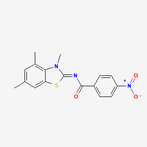 The synthesis of (E)-4-nitro-N-(3,4,6-trimethylbenzo[d]thiazol-2(3H)-ylidene)benzamide typically involves multi-step organic reactions. One common approach starts with the preparation of the benzo[d]thiazole core, followed by the introduction of the nitro group and the benzamide moiety. The reaction conditions often include the use of strong acids or bases, organic solvents, and specific temperature controls to ensure the desired product formation.