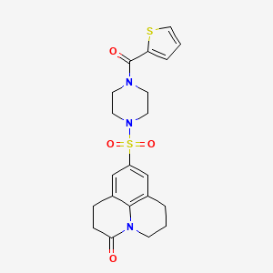7-{[4-(thiophene-2-carbonyl)piperazin-1-yl]sulfonyl}-1-azatricyclo[7.3.1.0^{5,13}]trideca-5,7,9(13)-trien-2-one is a complex organic compound with potential applications in various fields of scientific research. This compound features a unique structure that combines a thiophene ring, a piperazine moiety, and a tetrahydropyridoquinoline core, making it an interesting subject for chemical and pharmacological studies.