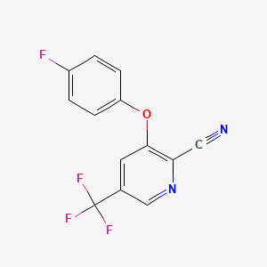 3-(4-Fluorophenoxy)-5-(trifluoromethyl)pyridine-2-carbonitrile is a chemical compound that has garnered interest in various scientific fields due to its unique structural properties and potential applications. This compound features a pyridine ring substituted with a fluorophenoxy group, a trifluoromethyl group, and a carbonitrile group, making it a versatile molecule for research and industrial purposes.