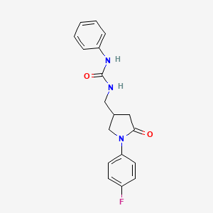 1-((1-(4-Fluorophenyl)-5-oxopyrrolidin-3-yl)methyl)-3-phenylurea is a synthetic organic compound that has attracted attention due to its potential biological activities. This compound is characterized by its unique molecular structure, which includes a pyrrolidinone ring and a urea moiety, making it a candidate for various therapeutic applications.