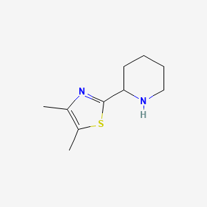 The nitrogen atom in the piperidine ring is sp³-hybridized, and its lone pair of electrons is readily available for protonation, making piperidine a relatively strong base (pKa of the conjugate acid is approximately 11.12). The presence of the 4,5-dimethylthiazol-2-yl substituent at the C-2 position is expected to have a minor electronic effect on the basicity of the piperidine nitrogen. The thiazole ring is a π-deficient heteroaromatic system and can exert a weak electron-withdrawing inductive effect, which might slightly decrease the basicity of the piperidine nitrogen compared to unsubstituted piperidine.