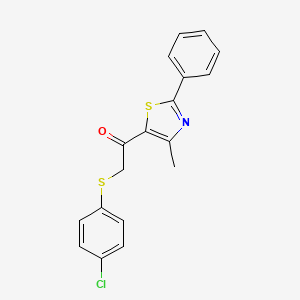 2-[(4-Chlorophenyl)sulfanyl]-1-(4-methyl-2-phenyl-1,3-thiazol-5-yl)-1-ethanone is a complex organic compound with a molecular formula of C18H14ClNOS2. This compound is characterized by the presence of a thiazole ring, a chlorophenyl group, and a sulfanyl linkage. Thiazole derivatives are known for their diverse biological activities, including antimicrobial, antiviral, and anticancer properties .