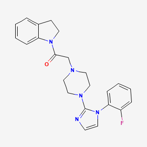 2-(4-(1-(2-fluorophenyl)-1H-imidazol-2-yl)piperazin-1-yl)-1-(indolin-1-yl)ethanone is a synthetic organic compound. It incorporates an imidazole ring, a fluorophenyl group, a piperazine moiety, and an indolinone structure. These distinct functional groups imbue the compound with unique chemical and biological properties, making it an interesting subject of study in various fields.