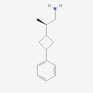 The mechanism by which (2R)-2-(3-Phenylcyclobutyl)propan-1-amine exerts its effects involves its interaction with molecular targets such as enzymes and receptors. The compound’s amine group can form hydrogen bonds and electrostatic interactions with active sites, while the phenyl and cyclobutyl groups contribute to hydrophobic interactions and steric effects. These interactions can modulate the activity of the target molecules, leading to various biological and chemical outcomes.