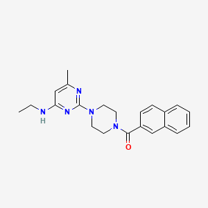 The synthesis of N-ethyl-6-methyl-2-[4-(naphthalene-2-carbonyl)piperazin-1-yl]pyrimidin-4-amine typically involves multiple steps, starting with the preparation of the pyrimidine core. This can be achieved through the condensation of appropriate aldehydes and amines under controlled conditions. The piperazine ring is then introduced through nucleophilic substitution reactions, followed by the attachment of the naphthalene moiety via acylation reactions.