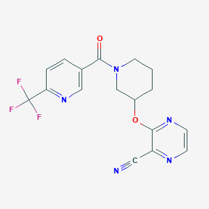 3-((1-(6-(Trifluoromethyl)nicotinoyl)piperidin-3-yl)oxy)pyrazine-2-carbonitrile is a complex organic compound notable for its potential biological activities. With a molecular formula of C17H14F3N5O2 and a molecular weight of 377.32 g/mol, this compound exhibits structural features that may confer various pharmacological properties. This article reviews the biological activity of this compound, focusing on its mechanisms, therapeutic potential, and related research findings.