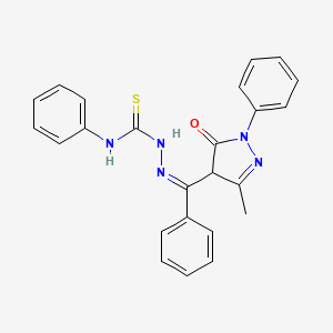 The mechanism of action of 1-[(E)-[(3-methyl-5-oxo-1-phenyl-4H-pyrazol-4-yl)-phenylmethylidene]amino]-3-phenylthiourea involves interactions with specific molecular targets, often enzymes or proteins, leading to inhibition or modulation of their activity. This can affect various biological pathways, resulting in observed pharmacological effects such as anti-inflammatory or antimicrobial actions.
