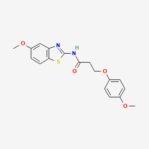 The mechanism of action of N-(5-methoxy-1,3-benzothiazol-2-yl)-3-(4-methoxyphenoxy)propanamide would depend on its specific biological target. Generally, benzothiazole derivatives can interact with various molecular targets such as enzymes, receptors, or DNA. The methoxy and amide groups may enhance binding affinity and specificity through hydrogen bonding, hydrophobic interactions, or electronic effects.