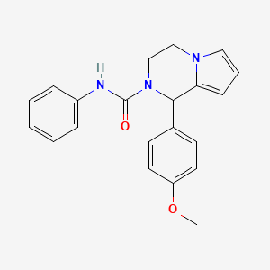 The synthesis of 1-(4-methoxyphenyl)-N-phenyl-1H,2H,3H,4H-pyrrolo[1,2-a]pyrazine-2-carboxamide can be achieved through various synthetic routes. One common method involves the cyclization of appropriate precursors under specific reaction conditions. For instance, the reaction of 2,2-dihydroxy-1-(4-methoxyphenyl) ethanone with phenylhydrazine can lead to the formation of the desired pyrazine derivative . Industrial production methods may involve optimizing these reactions for higher yields and purity, often using catalysts and controlled environments to ensure consistency and scalability .