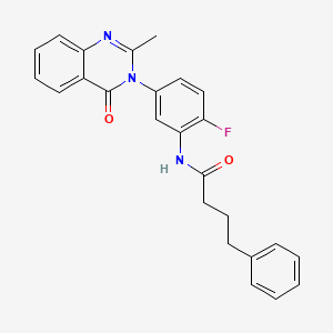 The mechanism of action of N-(2-fluoro-5-(2-methyl-4-oxoquinazolin-3(4H)-yl)phenyl)-4-phenylbutanamide involves its interaction with specific molecular targets, such as enzymes or receptors. The compound can bind to the active site of enzymes, inhibiting their activity, or interact with receptors to modulate their signaling pathways. The presence of the fluoro and phenyl groups enhances its binding affinity and specificity.