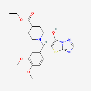 Ethyl 1-((3,4-dimethoxyphenyl)(6-hydroxy-2-methylthiazolo[3,2-b][1,2,4]triazol-5-yl)methyl)piperidine-4-carboxylate is a structurally complex heterocyclic compound combining a piperidine-4-carboxylate core with a 3,4-dimethoxyphenyl group and a fused thiazolo-triazole moiety. The thiazolo[3,2-b][1,2,4]triazole system is known for its electron-rich, planar structure, which facilitates π-π stacking and hydrogen bonding with enzymes or receptors . The ethyl ester group at the piperidine position may enhance lipophilicity, influencing pharmacokinetic properties like membrane permeability and metabolic stability .