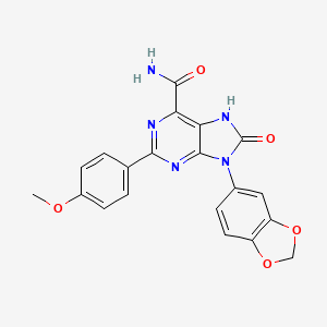 The compound's structure features a purine core with a benzodioxole and methoxyphenyl substituents. Its IUPAC name is N-(1,3-benzodioxol-5-yl)-2-(4-methoxyphenyl)-8-oxo-8,9-dihydro-7H-purine-6-carboxamide. The molecular formula is CHNO, and it has a molecular weight of approximately 378.37 g/mol.