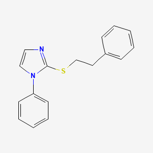The synthesis of 2-(phenethylsulfanyl)-1-phenyl-1H-imidazole typically involves the reaction of 1-phenyl-1H-imidazole with phenethylsulfanyl chloride in the presence of a base such as potassium carbonate. The reaction is carried out in an organic solvent like dimethylformamide (DMF) at elevated temperatures to facilitate the formation of the desired product.
