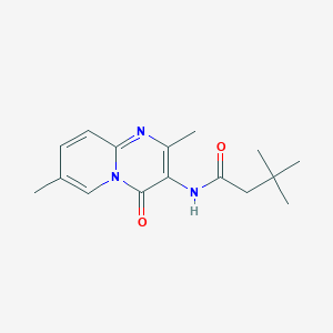 N-(2,7-Dimethyl-4-oxo-4H-pyrido[1,2-a]pyrimidin-3-yl)-3,3-dimethylbutanamide is a synthetic heterocyclic compound featuring a pyrido[1,2-a]pyrimidin-4-one core substituted with methyl groups at positions 2 and 5. The 3-position is functionalized with a 3,3-dimethylbutanamide group. The compound’s molecular formula is C₁₆H₂₁N₃O₂ (calculated based on structural analogs and substituent patterns), with an approximate molecular weight of 287.36 g/mol. Its synthesis likely involves condensation reactions between substituted pyrido-pyrimidine intermediates and acyl chlorides or activated carboxylic acid derivatives, as observed in related compounds .