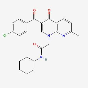 2-(3-(4-Chlorobenzoyl)-7-methyl-4-oxo-1,8-naphthyridin-1(4H)-yl)-N-cyclohexylacetamide is a nitrogen-containing heterocyclic compound characterized by a 1,8-naphthyridine core substituted with a 4-chlorobenzoyl group at position 3, a methyl group at position 7, and an N-cyclohexylacetamide side chain.