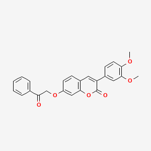 3-(3,4-Dimethoxyphenyl)-7-(2-oxo-2-phenylethoxy)-2H-chromen-2-one is a synthetic coumarin derivative featuring a 3,4-dimethoxyphenyl substituent at position 3 and a 2-oxo-2-phenylethoxy group at position 7 of the chromen-2-one scaffold. Its molecular formula is C₂₅H₂₀O₆, with a molecular weight of 428.43 g/mol (CAS RN: 859661-12-4) . The compound’s structure combines a methoxy-substituted aromatic ring and a ketone-containing side chain, which are critical for its interactions with biological targets.