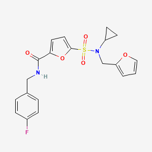 This compound is a furan-2-carboxamide derivative featuring a sulfamoyl group substituted with cyclopropyl and furan-2-ylmethyl moieties, along with a 4-fluorobenzyl substituent. Its molecular complexity arises from the dual substitution on the sulfamoyl group and the incorporation of fluorinated aromatic systems, which are common in medicinal chemistry for enhancing metabolic stability and target binding .
