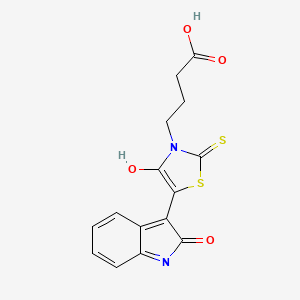 The synthesis of (Z)-4-(4-oxo-5-(2-oxoindolin-3-ylidene)-2-thioxothiazolidin-3-yl)butanoic acid typically involves multi-step organic reactions. One common method includes the condensation of 2-oxoindoline-3-carboxylic acid with thiosemicarbazide to form an intermediate, which is then cyclized to produce the thioxothiazolidinone ring. The final step involves the addition of butanoic acid to the cyclized product under controlled conditions.