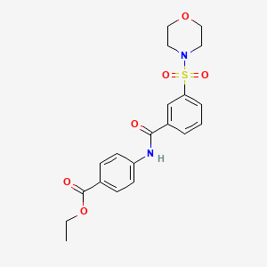 The mechanism of action of ETHYL 4-[3-(MORPHOLINE-4-SULFONYL)BENZAMIDO]BENZOATE involves its interaction with specific molecular targets and pathways. The sulfonyl group is known to interact with various enzymes and proteins, potentially inhibiting their activity. The morpholine ring can enhance the compound’s solubility and bioavailability, allowing it to effectively reach its targets within biological systems .