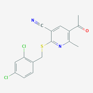 The mechanism of action of 5-Acetyl-2-[(2,4-dichlorobenzyl)sulfanyl]-6-methylnicotinonitrile involves its interaction with specific molecular targets and pathways. The compound may inhibit certain enzymes or receptors, leading to its observed biological effects. Detailed studies are required to elucidate the exact molecular targets and pathways involved.
