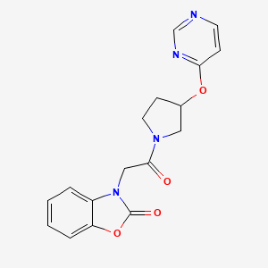 The mechanism of action of 3-(2-oxo-2-(3-(pyrimidin-4-yloxy)pyrrolidin-1-yl)ethyl)benzo[d]oxazol-2(3H)-one involves its interaction with specific molecular targets, such as enzymes or receptors. The pyrimidine moiety may facilitate binding to nucleic acid structures, while the benzo[d]oxazole core can interact with protein targets. These interactions can modulate biological pathways, leading to therapeutic effects.