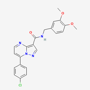 7-(4-chlorophenyl)-N-[(3,4-dimethoxyphenyl)methyl]pyrazolo[1,5-a]pyrimidine-3-carboxamide is a member of the pyrazolo[1,5-a]pyrimidine family, which has garnered attention in medicinal chemistry due to its diverse biological activities. This compound is characterized by a complex structure that includes a pyrazolo core with various substituents that potentially enhance its pharmacological properties.