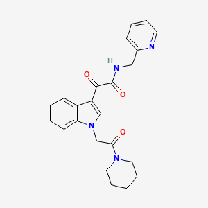 The synthesis of 2-oxo-2-{1-[2-oxo-2-(piperidin-1-yl)ethyl]-1H-indol-3-yl}-N-[(pyridin-2-yl)methyl]acetamide typically involves multi-step organic reactions. The process begins with the preparation of the indole core, followed by the introduction of the piperidine ring and the pyridine moiety. Common reagents used in these reactions include various acids, bases, and solvents such as dichloromethane and ethanol. The reaction conditions often require controlled temperatures and pressures to ensure the desired product is obtained with high purity and yield .