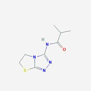 N-(5,6-Dihydrothiazolo[2,3-c][1,2,4]triazol-3-yl)isobutyramide is a heterocyclic compound featuring a fused thiazolo-triazole core (5,6-dihydrothiazolo[2,3-c][1,2,4]triazol-3-yl) substituted with an isobutyramide group. The isobutyramide moiety (C₄H₈NO) enhances steric and electronic properties, which may influence binding affinity and solubility.