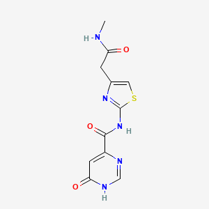 6-Hydroxy-N-(4-(2-(methylamino)-2-oxoethyl)thiazol-2-yl)pyrimidine-4-carboxamide is a heterocyclic compound featuring a pyrimidine core substituted with a hydroxyl group at position 6 and a carboxamide group at position 2. The carboxamide moiety is linked to a thiazol-2-yl ring via a methylamino-oxoethyl spacer. The compound’s polarity, conferred by the hydroxyl and carboxamide groups, may influence its solubility and pharmacokinetic properties.