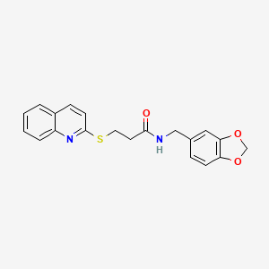 The synthesis of N-[(2H-1,3-benzodioxol-5-yl)methyl]-3-(quinolin-2-ylsulfanyl)propanamide typically involves multiple steps. One common route includes the alkylation of 2-(1,3-benzodioxol-5-yl)acetonitrile with bis(2-chloroethyl) ether, followed by reduction with lithium tetrahydroaluminate . Another method involves the use of a Pd-catalyzed C-N cross-coupling reaction .