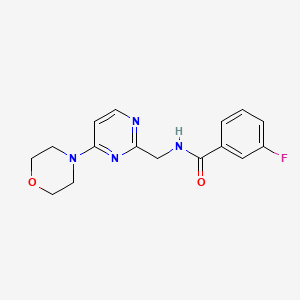 3-fluoro-N-((4-morpholinopyrimidin-2-yl)methyl)benzamide is a synthetic organic compound that has garnered attention in medicinal chemistry due to its potential biological activities. It features a morpholine ring and a pyrimidine moiety linked through a benzamide structure, which contributes to its unique pharmacological properties. This compound is primarily investigated for its role as an enzyme inhibitor and its therapeutic potential in treating various diseases, including cancer and inflammatory disorders.