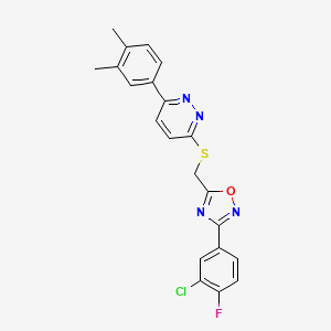 The synthesis of 3-({[3-(3-CHLORO-4-FLUOROPHENYL)-1,2,4-OXADIAZOL-5-YL]METHYL}SULFANYL)-6-(3,4-DIMETHYLPHENYL)PYRIDAZINE typically involves multiple steps, starting from commercially available precursors. One common synthetic route involves the formation of the oxadiazole ring through the reaction of a hydrazide with a carboxylic acid derivative under dehydrating conditions. The resulting oxadiazole intermediate is then coupled with a pyridazine derivative through a series of nucleophilic substitution and coupling reactions .