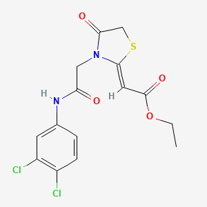 Ethyl (2Z)-2-[3-[2-(3,4-dichloroanilino)-2-oxoethyl]-4-oxo-1,3-thiazolidin-2-ylidene]acetate is a thiazolidinone-based heterocyclic compound characterized by a conjugated enone system and a 3,4-dichloroanilino substituent. The compound’s structure combines a thiazolidin-4-one core with an ethyl acetate moiety, making it a versatile intermediate for synthesizing pharmacologically active derivatives. Thiazolidinones are widely studied for their antimicrobial, anti-inflammatory, and anticancer activities, with substitutions on the aromatic ring (e.g., halogens) modulating these properties .