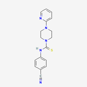 The mechanism of action of 4-(((4-(2-Pyridyl)piperazinyl)thioxomethyl)amino)benzenecarbonitrile involves its interaction with specific molecular targets. The compound’s piperazine and pyridine moieties allow it to bind to various receptors and enzymes, potentially modulating their activity. The thioxomethyl group may also play a role in its biological activity by influencing the compound’s binding affinity and specificity .