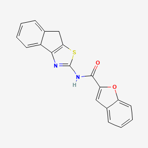 The compound features a unique combination of an indeno-thiazole moiety and a benzofuran carboxamide group. This structural complexity contributes to its varied biological activities. The synthesis of this compound typically involves multi-step organic reactions, including the formation of the indeno-thiazole core and the attachment of the benzofuran carboxamide group using coupling reactions with activating agents like N,N’-dicyclohexylcarbodiimide (DCC) .
