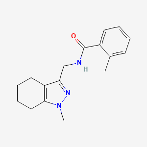 2-Methyl-N-((1-methyl-4,5,6,7-tetrahydro-1H-indazol-3-yl)methyl)benzamide is a benzamide derivative featuring a 2-methylbenzoyl group linked via an amide bond to a (1-methyltetrahydroindazol-3-yl)methyl substituent. Potential applications may include pharmaceutical (e.g., antiviral or anti-HIV activity) or agrochemical uses, inferred from structurally similar benzamides in the evidence .