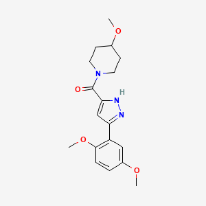 The compound (3-(2,5-dimethoxyphenyl)-1H-pyrazol-5-yl)(4-methoxypiperidin-1-yl)methanone is a synthetic organic molecule that features a pyrazole ring substituted with a dimethoxyphenyl group and a methoxypiperidinyl group