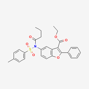 Ethyl 5-[N-(4-methylbenzenesulfonyl)butanamido]-2-phenyl-1-benzofuran-3-carboxylate is a complex organic compound classified as a benzofuran derivative. This compound is characterized by its unique structure, which includes a benzofuran core, a butyryl group, a sulfonyl group, and an ethyl ester. Its molecular formula is with a molecular weight of 505.6 g/mol .