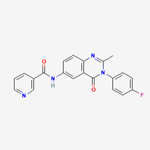 The synthesis of N-(3-(4-fluorophenyl)-2-methyl-4-oxo-3,4-dihydroquinazolin-6-yl)nicotinamide typically involves multi-step organic reactions. One common synthetic route includes the condensation of 4-fluoroaniline with 2-methyl-4-oxo-3,4-dihydroquinazoline-6-carboxylic acid, followed by the coupling with nicotinoyl chloride under basic conditions. The reaction is usually carried out in the presence of a suitable base such as triethylamine or pyridine, and the product is purified through recrystallization or chromatography.