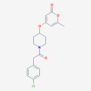 This compound is a synthetic pyrone derivative characterized by a piperidin-4-yloxy moiety linked to a 4-chlorophenylacetyl group and a 6-methyl-2H-pyran-2-one core. The 4-chlorophenyl group may enhance lipophilicity and receptor binding, while the pyranone core is associated with diverse bioactivities, including anti-inflammatory and enzyme-inhibitory effects .