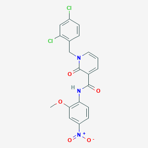 1-(2,4-Dichlorobenzyl)-N-(2-methoxy-4-nitrophenyl)-2-oxo-1,2-dihydropyridine-3-carboxamide is a synthetic compound that belongs to the class of dihydropyridines. This compound has garnered interest in medicinal chemistry due to its diverse biological activities and potential therapeutic applications. Its unique structural features, including a dihydropyridine ring and various substituents, contribute to its reactivity and interaction with biological systems.