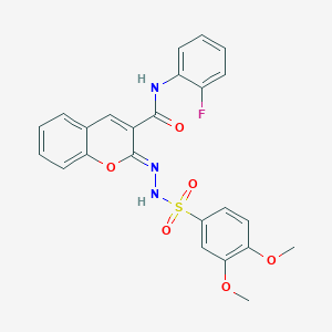 The compound's IUPAC name is (2Z)-2-[(3,4-dimethoxyphenyl)sulfonylhydrazinylidene]-N-(2-fluorophenyl)chromene-3-carboxamide. It has the following molecular formula: